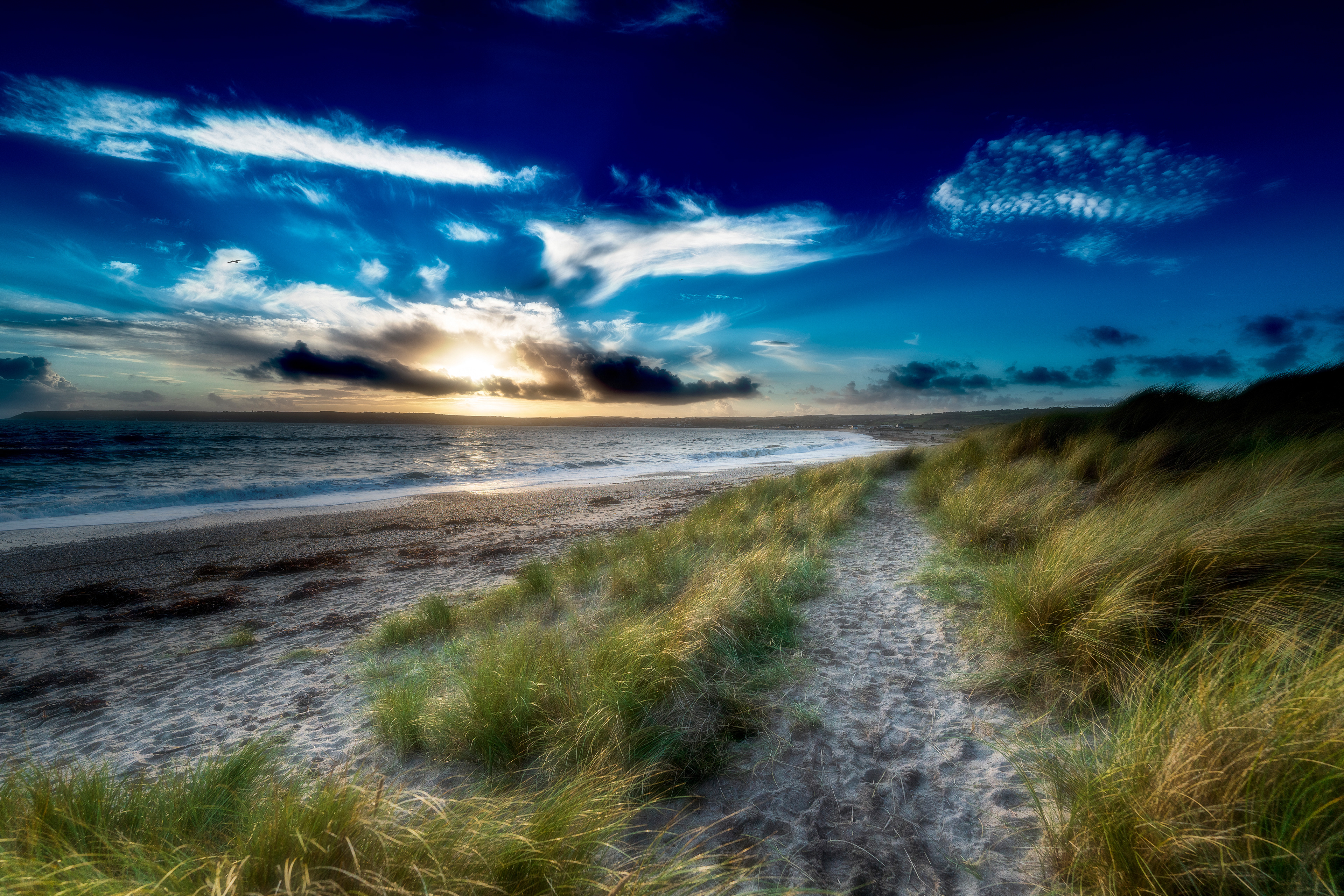 A windswept sandy beach at sunset. The crowds may of gone and the beach may be quiet, the numerous footprints are now being sculpted and softened by the strong on-shore winds.