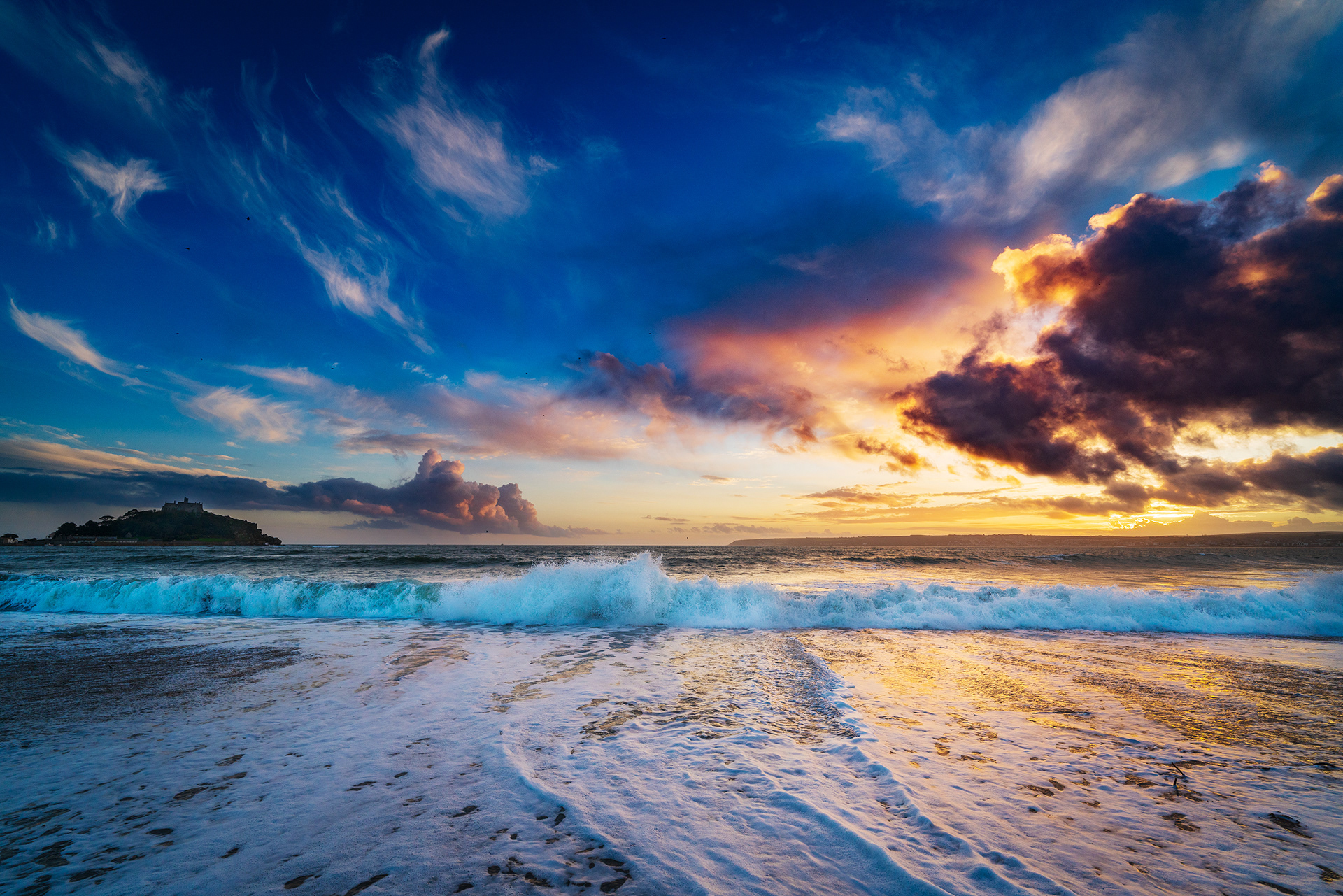 As the sun sets behind a wall of storm clouds in Mounts Bay in West Cornwall, St Michaels Mount falls into shadow.