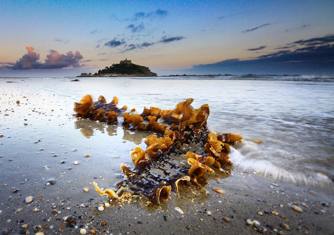 A piece of Seaweed is washed ashore on the incoming tide. Marazion beach West Cornwall with St Michaels mount in the background.